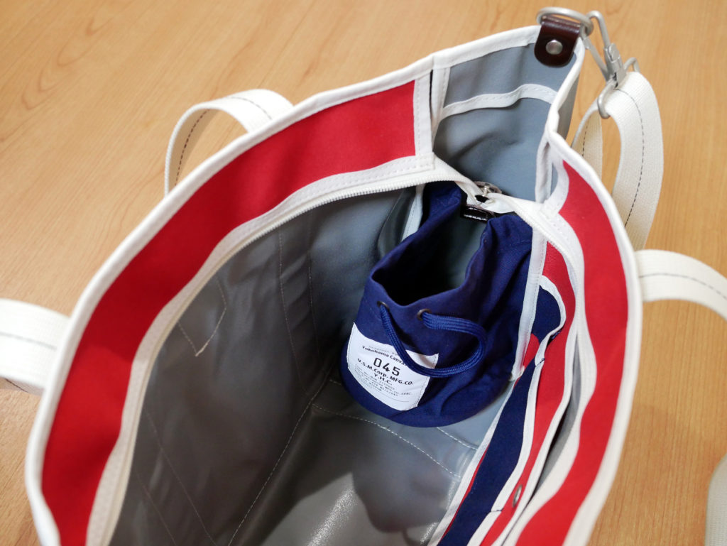 グレー部分は、武鑓帆布綿9号帆布パラフィンという撥水効果のある生地を採用しているとのこと。海上自衛隊の船舶で実際に使用されている生地だそうで、防水・耐光・耐塩・防炎処理が施されているとのこと。こういうところは男心をくすぐりますね!
