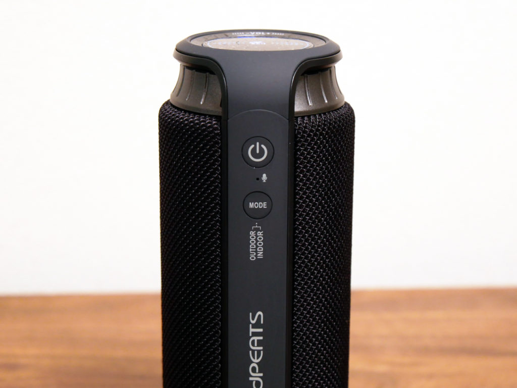このスピーカーにはインドアモードとアウトドアモードと2種類のモードが搭載されており、MODEボタンから切り替えることができます。インドアモード時は低音が強調され、アウトドアモードでは高音がより響く仕様になっています。私自身は低音の強いインドアモードの方が好みですが、外で使うと確かに低音は音が届きにくいため、高音重視のアウトドアモードの方が聞き取りはしやすいです。