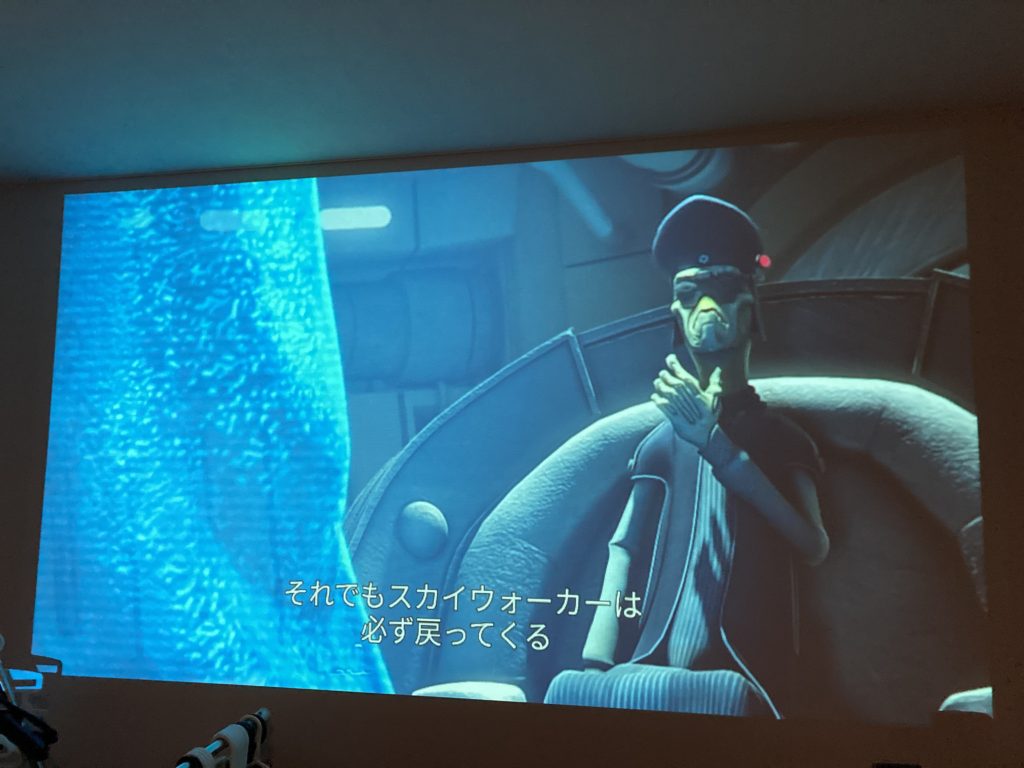 日中カーテンを閉めた室内では十分な明るさ。リビングなどスクリーンを付けるスペースがなくても壁に100インチほどの画面が展開出来るのはいいですね。