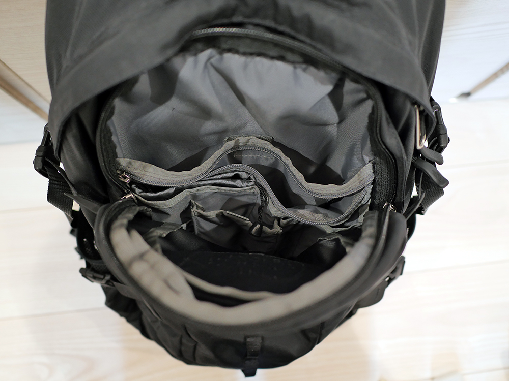 ロゴマーク下にある手前のポケットを開けるとこんな感じです。財布など大事な物はファスナーの付いたポケットに格納出来、電車内でのスリにも対応できるのは嬉しいポイント。