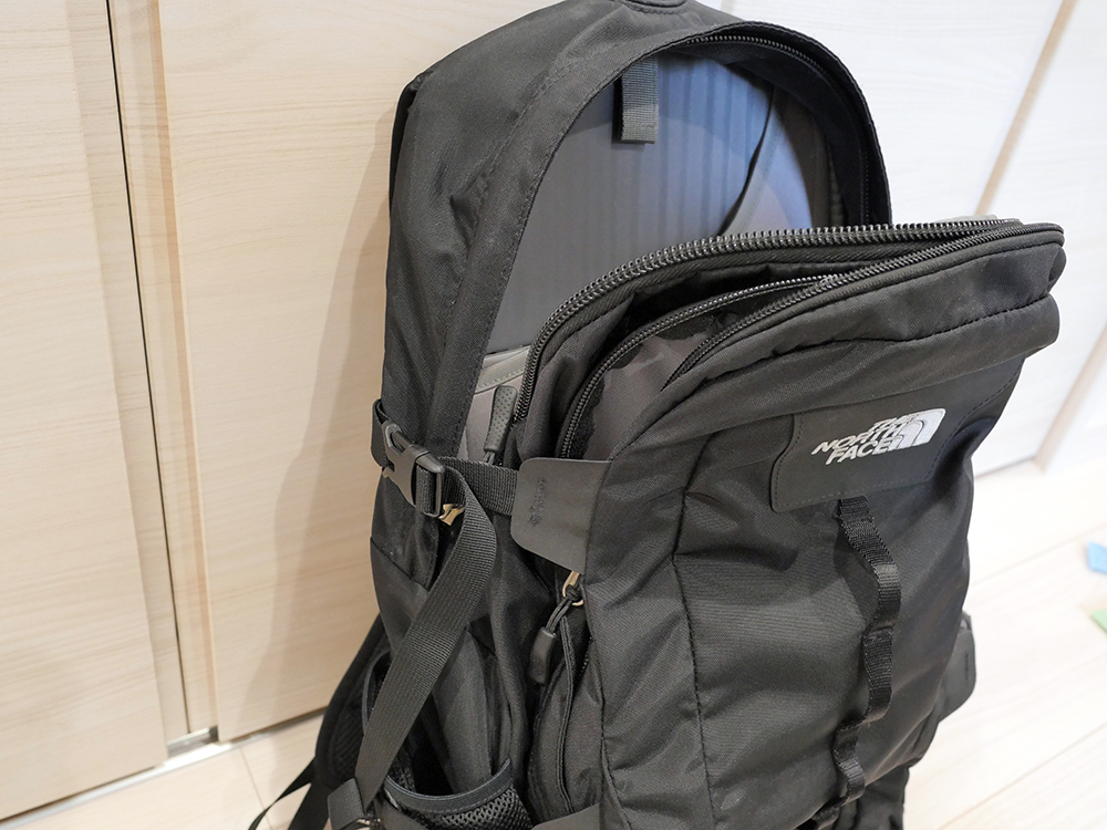 私がいろんなメーカーのリュックを使ってこれはいい!!と感じたのはこのNorthfaceとグレゴリーでした。Hotshotはリュックそのものの重量が1,135gと若干重めなのですが、その分背中に当たる部分のクッションがしっかりしていたり、ハーネスもメッシュが付いたプレートが入っており、相応の安心感があります。