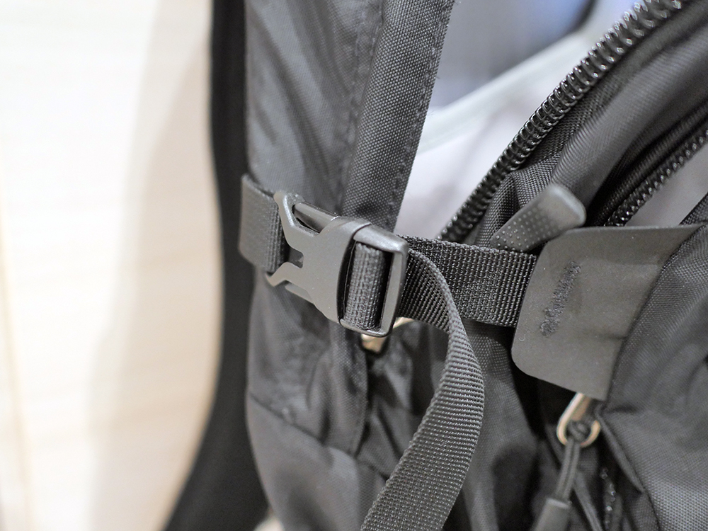 リュックってガバッと開いて欲しい時もあれば、そうじゃない場面もあると思います。このリュックはそうじゃない場面に適した作りになっており、ジッパーを思いっきり開けてもこのバックルのおかげでリュックが全開になり、中身が飛び出すのを防いでくれるんです