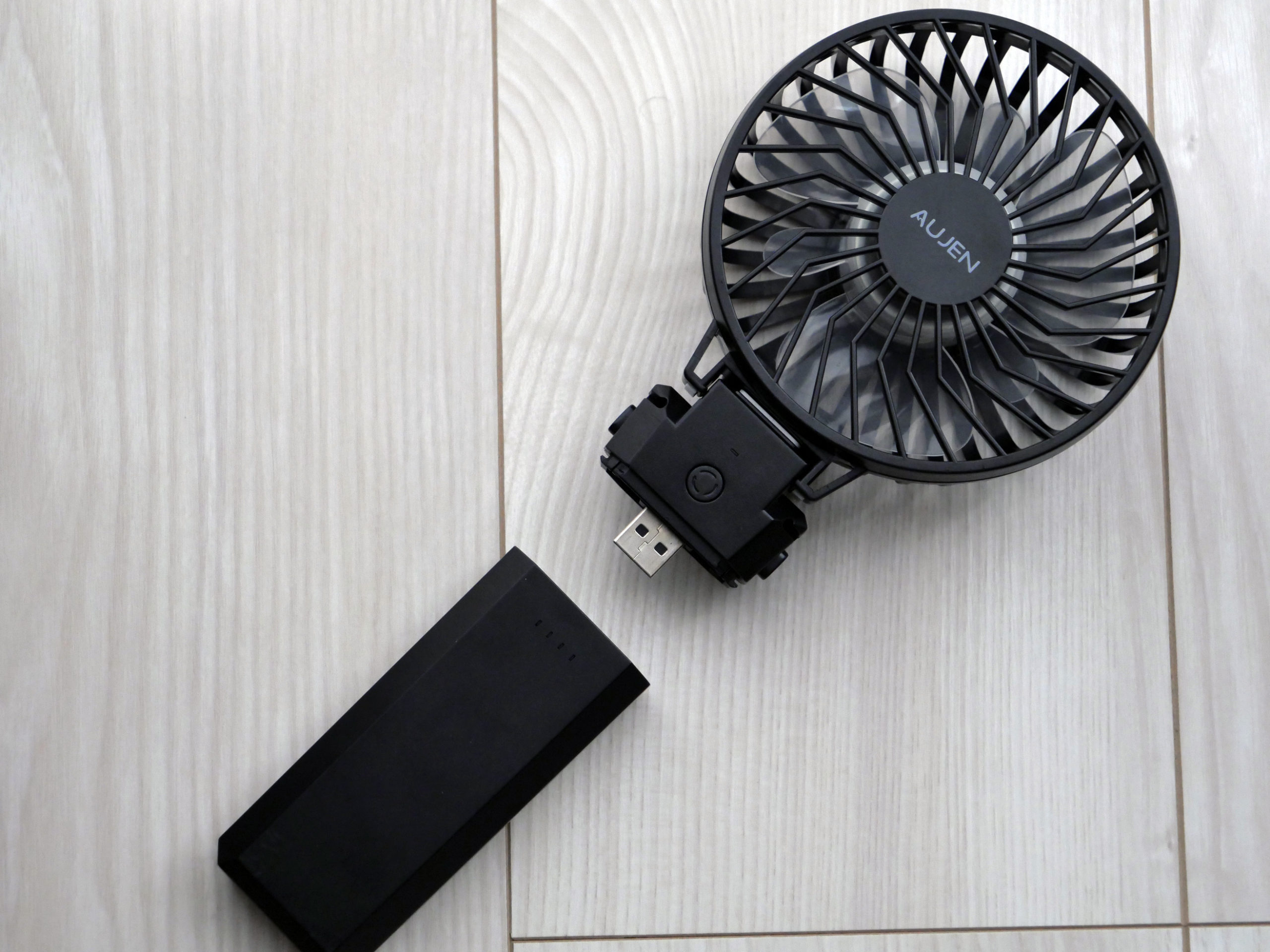 ファン側はUSB2.0なので、うまくこの角度で挿して問題ない場所であればそちらから給電して備え付け扇風機としても使えるかも
